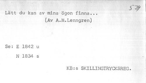 //// Lätt du kan av mina ögon finna... //// t //// (Av A.M.Lenngren) //// *"** - ^ //// f //// i //// Se: E 1842 u //// N 1834 s //// KB:s SKILLINGTRYCKSREG. ////