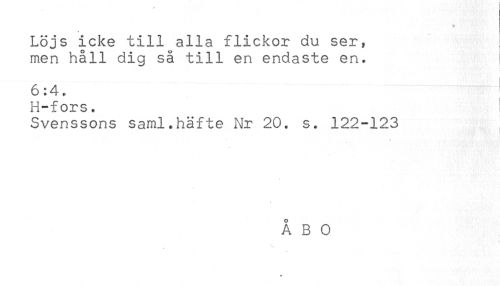 //// Löjs icke till alla flickor du ser, //// men håll dig så till en endaste en. //// 6:4, //// H-fors. //// Svenssons saml.häfte Nr 20. s. 122-123 ////