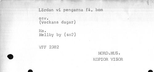 //// Lördan vi pengarna fä, bom //// ,----- .. . //// - //// osv. //// (veckans dagar) //// Ha. //// Mellby by (sn?) //// ^ # //// VFF 2382 //// ^ NORD.MUS. //// ^ KOPIOR VISOR //// i < ////