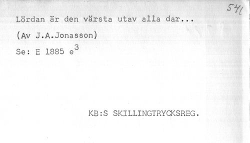 //// Lördan är den värsta utav alla dar... //// (Av J.A.Jonasson) //// Se: E 1885 e^ //// i //// i //// ' //// - //// - //// KB:S SKILLINGTRYCKSREG. ////