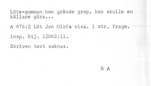 //// Lote-gumman hon grävde grop? hon skulle en //// källare göra... //// A 476:2 Löt Jan Olofs visa. 1 str. fragm. //// insp. Rtj. 12062:11. //// Skriven text saknas. //// R A ////