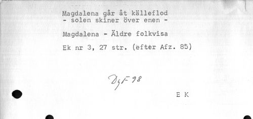 //// Magdalena går åt källeflod //// - solen skiner över enen - //// - //// [ //// Magdalena - Äldre folkvisa //// Ek nr 3, 27 str. (eftér Afz. 85) ////