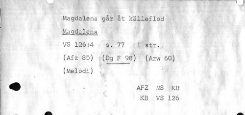 //// [ * //// I Magdalena går åt källeflod //// i Magdalena //// i VS 126:4 s. 77 1 str. //// ) (Afz 85) (Dg F 98) (Arw 60) //// j (Melodi) //// ! AFZ MS KB //// KB VS 126 ////