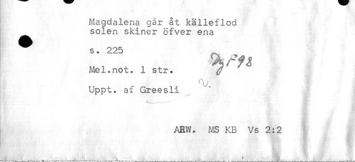 //// Magdalena gar åt källeflod //// solen skiner öfver ena //// s* //// Mel.not. 1 str. ^ //// Uppt. af Greesli //// ARW. MS KB Vs 2:2 ////