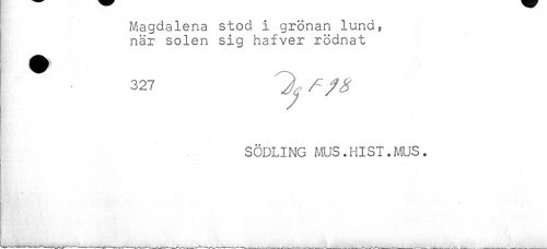 //// Magdalena stod i grönan lund, //// när solen sig hafver rodnat //// B * ^ //// 327 ^ //// SÖDLING r^S.HIST.MUS. //// * * ,< ////