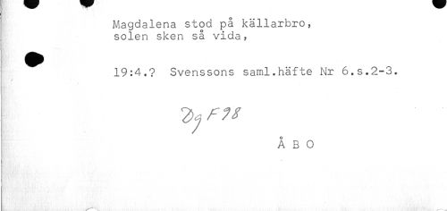 //// Magdalena stod på källarbro, //// solen sken så vida? //// ^^ 19:4.? Svenssons saml.häfte Nr 6.S.2-3. //// //// /I 3y ^^ //// I ÅBO //// ^ - //// f' //// j //// j //// * ////