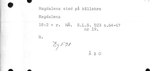 //// : Magdalena stod på källebro //// I Magdalena //// 18:2 + r. NÄ. S.L.S. 523 s.64-67 //// nr 19. //// N. //// ÅBO ////