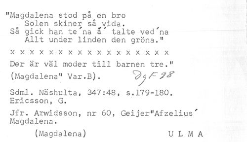 //// "Magdalena stod på en bro //// Solen skiner så vida. //// Så gick han te'na å' talte ved'na //// Allt under linden den gröna." //// xxxxxxxxxxxxxxxxx //// Der är väl moder till barnen tre." //// (Magdalena" Var.B). //// Sdml. Näshulta, 347:48, s.179-180. //// Ericsson, G. //// Jfr. Arwidsson, nr 60, Geijer"Afzelius^ //// Magdalena. //// (Magdalena) U L M A ////