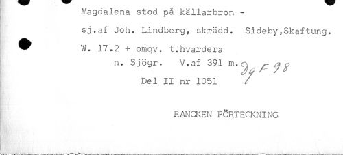 //// Magdalena stod pa källarbron - //// sj.af Joht Lindberg, skrädd. Sideby,Skaftung. //// ^ W. 17.2 + omav. t.hvardera //// n. Sjögr. V.af 391 m, ^^ //// Del II nr 1051 //// RANCKEN FÖRTECKNING ////