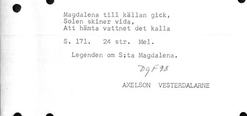 //// Magdalena till källan gick, //// Solen skiner vida, //// Att hämta vattnet det kalla //// H^HHHHjHjÉ^ * ..-.—.i..------ //// S. 171. 24 str. Mel. //// Legenden om S;ta Magdalena. //// AXELSON VESTERDALARNE ////