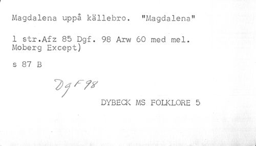 //// Magdalena uppå källebro.. "Magdalena" //// 1 str.Afz 85 Dgf. 98 Arw 60 med mel. //// Moberg Except) //// s 87 B //// DYBECK MS FOLKLORE 5 //// 'J ////