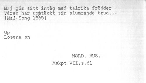 //// Maj gör sitt intåg med talrika fröjder //// Våren har upptäckt sin slumrande brud... //// (Maj-Song 1865) //// Up //// Losena sn //// NORD. MUS. //// Mskpt VII,s.61 ////