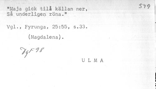 //// "Maja gick tilå källan ner, //// Sa underligen röna." //// Vgl., Fyrunga, 25:55, s.33. //// (^Aagdalena). //// < //// U L M A ////