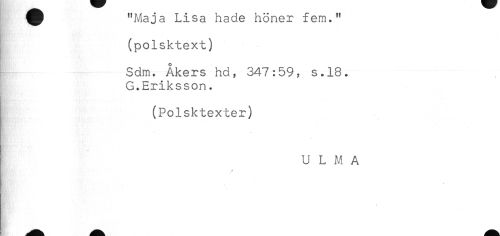 //// ^ "Maja Lisa hade höner fem." //// (polsktext) //// Sdm. Åkers hd, 347:59, s.18. //// G.Eriksson. //// (Polsktexter) //// U L M A //// * ////