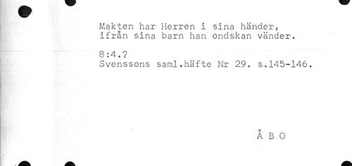 //// Makten har Herren i sina händer, //// ifrån sina barn han ondskan vänder. //// 8:4.? //// Svenssons saml.häfte Nr 29. s.145-146. ////