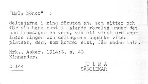 //// H //// ) //// i //// <* //// t- //// "Mala bönor" : //// deltagarna i ring förutom en, som sitter och //// för sin hand runt i malande rörelsé under det } //// han framsäger en vers? vid ett visst ord upp- , //// löses ringen och deltagarna uppsöka vissa ! //// platser, den, som kommer sist, får sedan mala. //// Nrk., Asker. 1914:3, s. 43 //// Kinnander* //// D 144 L M A //// tLjLLl SANGLEKAR //// L * * . ////