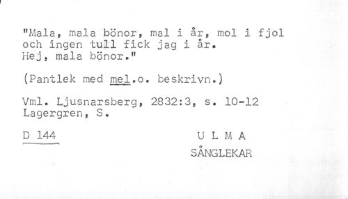 //// "Mala, mala bönor, mal i år, mol i fjol //// och ingen tull fick jag i år. //// Hej, mala bönor*" //// (Pantlek med me1 * o * beskrivn*) //// Vml. Ljusnarsberg, 2832:3, s. 10-12 //// Lagergren, S* //// D 144 U L M A //// '! ' i i ^ //// SÅNGLEKAR ////