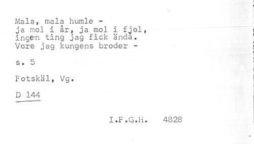 //// - ' .* j //// Mala^ mala humle - ! //// ja mol i år, ja mol i fjol, s //// ingen ting jag fick ända. ' //// Vore jag kungens broder - j //// t //// s. 5 ! //// i //// Fotskäl, Vg* ! //// D^144 //// I.F.G.H. 4828 //// i //// < //// * ////