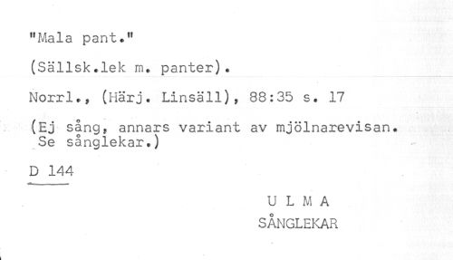 //// "Mala pant." //// (Sällsk.lek m. panter). //// Norrl.y (Härj. Linsäll), 88:35 s. 17 //// (Ej sång, annars variant av mjölnarevisan. //// Se sånglekar.) //// D 144 //// *....... //// U L M A //// SÅNGLEKAR ////