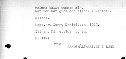 //// . . . . . .... ... ; //// l Malena salig gomman min. //// När hon här gick och slaonk i världen. //// - //// Malena. //// Uppt. av Jenny Danielsson 1932. //// Jät sn. Kinnevalds hd. Sm. //// - //// Nr 1171 //// ^ J ^^ //// ^ LANDS A^ALS ARKIVET I LUND //// ! * //// < ////