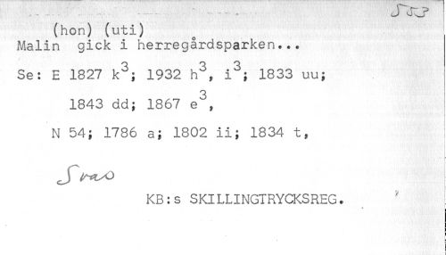 //// /V ^ J //// (hon) (uti) //// Malin gick i herregårdsparken.*. //// Se: E 1827 k^; 1932 h^, i^; 1833 uu; //// 1843 dd; 1867 //// . //// N 54; 1786 a; 1802 ii; 1834 t, //// - //// KB:s SKILLINGTRYCKSREG. ////
