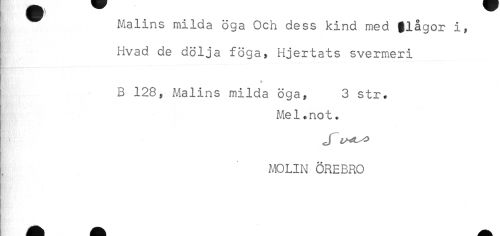 //// Malins milda öga Och dess kind med flågor i, //// Hvad de dölja föga, Hjertats svermeri //// * //// B 128, Malins milda öga, 3 str. //// Mel.not. //// MOLIN ÖREBRO ////