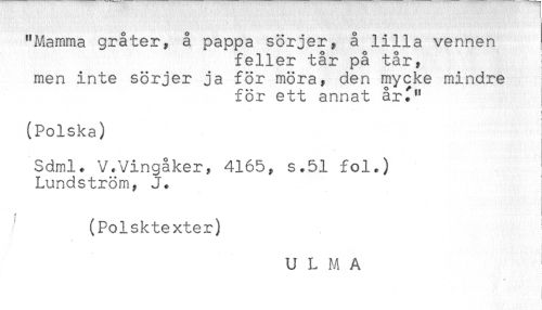 //// "Mamma gråter, å pappa sörjer, å lilla vennen //// feller tår på tår, //// men inte sörjer ja för möra, den mycke mindre //// för ett annat år^" //// (Polska) //// Sdml* V,Vingåker, 4165, s.51 fol,) ^ //// Lundström, J. //// (Polsktexter) //// U L M A //// t //// ] ////