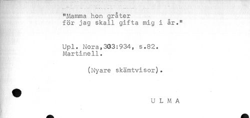//// < V- )-/' , ' ' ) ,, - ' - ^ , << '1 //// iV < * * //// ... //// "Mamma hon gråter //// för jag skall gifta mig i år." //// Upl, Nora,303:934, s<82. //// Martinell, //// (Nyare skämtvisor). //// ULMA ////