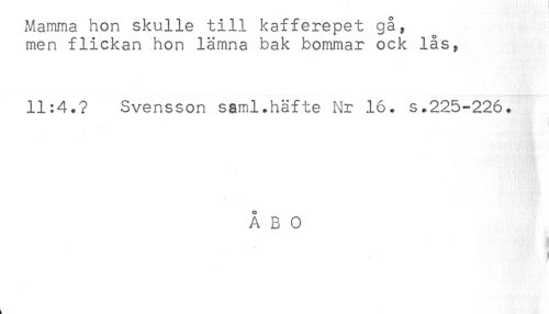 //// Mamma hon skulle till kafferepet gå, //// men flickan hon lämna bak bommar ock lås, //// 11:4.? Svensson saml.häfte Nr 16. s.225-226. //// ÅBO ////
