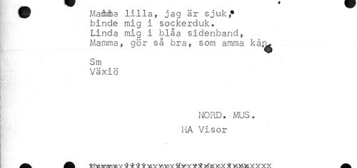 //// ^ Marh&a lilla, jag är sjuk^ //// binde mig i sockerduk. //// Linda mig i blåa sidenband, //// Mamma, gör så bra, som amma kå^ //// Sm //// Växiö //// .T //// NORD. MUS. //// ! HA Visor ////