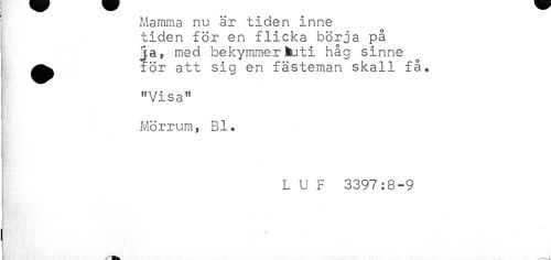 //// Mamma nu är tiden inne //// tiden för en flicka börja på //// ^a, med bekymmer huti håg sinne //// j ^^ för att sig en fästeman skall få* //// "Visa" //// i //// ! //// Mörrum, Bl. //// L U F 3397:8-9 ////