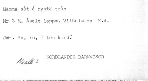 //// Mamma såt å nysta trån //// Nr 3 M. Åsele lappm. Vilhelmina E.S. //// Jmf. Ro^ ro, liten kindf //// NORDLANDER BARIWISOR ////