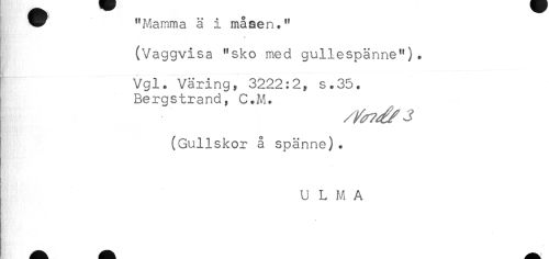//// * "Mamma ä i måaen." //// (Vaggvisa "sko med gullespänne"). //// Vgl. Väring, 3222:2, s.35. //// Bergstrand, C.M. //// (Gullskor å spänne)* //// U L M A ////