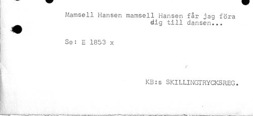//// Mamsell Hansen mamsell Hansen får jag föra //// dig till dansen... //// Se: E 1853 x //// - //// t //// KB:s SKILLINGTRYCKSREG. ////