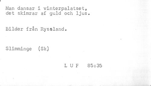 //// Man dansar i vinterpalatset, //// det skimrar af guld och ljus. //// Bilder från Ryssland. //// * //// Slimminge (Sk) //// L U F 85:35 ////
