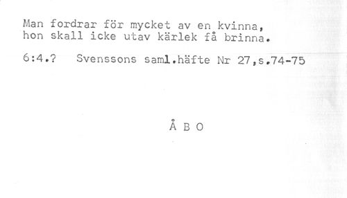 //// Man fordrar för mycket av en kvinna, //// hon skall icke utav kärlek få brinna. //// 6:4.? Svenssons saml.häfte Nr 27,s.74-75 //// ÅBO ////