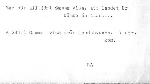 //// Man hör alltjämt €^mma visa, att landet är //// sämre än stan.... //// \ //// A 244:1 Gammal visa från landsbygden. 7 str. //// kom. //// RA //// \ ////