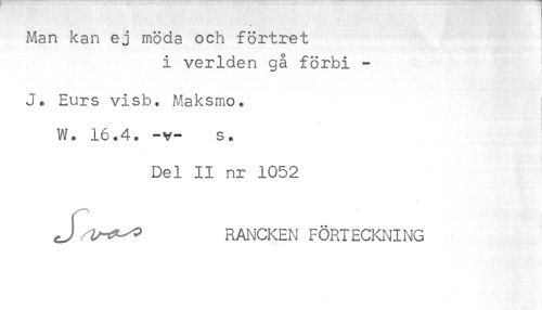 //// Man kan ej möda och förtret //// i verlden gå förbi - //// J*. Eurs visb. Maksmo* //// W. 16.4. -v- s. //// Del II nr 1052 //// <J RANCKEN FÖRTECKNING ////