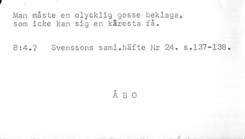 //// Man måste en olycklig gosse beklaga, //// som icke kan sig en kåresta få. //// 8:4*,? Svenssons saml.häfte Nr 24. s.137-138. //// ÅBO ////