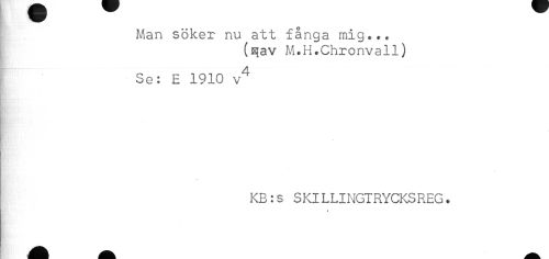 //// Man söker nu att fånga mig.., //// (s]av M.H.Chronvall) //// Se: E 1910 v^ //// KB:s SKILLINGTRYCKSREG. //// * ////