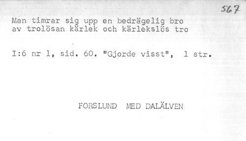 //// /L //// Man timrar sig upp en bedrägelig bro //// av trolösan kärlek och kärlekslös tro //// 1:6 nr 1, sid. 60. "Gjorde visst", 1 str. //// FORS LUND A-ED DALÄLVEN ////
