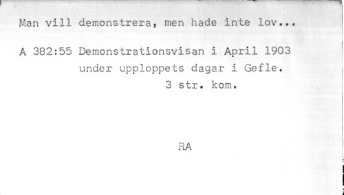 //// Man vill demonstrera, men hade inte lov... //// A 382:55 Demonstrationsvisan i April 1903 //// f //// under upploppets dagar i Gefle. //// 3 str. kom. //// t //// RA //// . //// 1 //// i ////