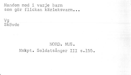 //// Mandom moa i varje barm //// som gör flickan kärleksvarm... //// Vg //// Skövde //// NORD. MUS. //// Mskpt. Soldatsånger III s.155. ////