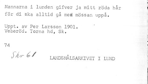 //// Mannarna i lunden gifver ja mitt röda hår ! //// i //// ; //// för di ska alltid gå mes! mössan uppå. r //// Uppt. av Per Larsson 1901. //// Veberöd. Torna hd, Sk. //// i //// 74 //// ^ ^ ^ ^ LANDS MÅLS ARKIVET I LUND ' //// h- ////