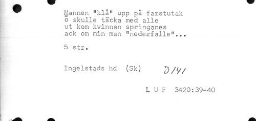 //// * Mannen "klå" upp på farstutak //// o skulle täcka med alle //// ut kom kvinnan springanes //// ack om min man "nederfalie"*.. //// 5 str. //// } - //// Ingelstads hd (Sk) D/^ //// /L U F 3420:39-40 ////