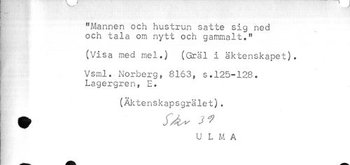 //// "Mannen och hustrun satte sig ned //// och tala om nytt och gammalt." //// (Visa med mel.) (Gräl i äktenskapet). //// ? Vsml. Norberg, 8163, s.125-128. //// Lagergren, E. //// (Äktenskapsgrälet). ////
