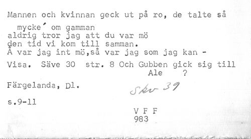 //// Mannen och kvinnan geck ut på ro, de talte så //// mycke^ om gamman //// aldrig tror jag att du var mö //// den tid vi kom till samman. //// A var jag int mö?så var jag som jag kan - //// Visa. Säve 30 str. 8 Och Gubben gick sig till //// Ale ? //// Färgelanda, Dl* ^ //// s.9-11 //// V F F //// 983 ////