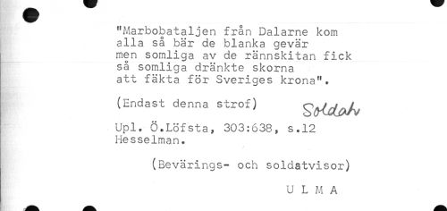 //// "A^arbobataljen från Dalarne kom //// alla så bär de blanka gevär //// ! men somliga av de rännskitan fick //// så somliga dränkte skorna //// att fäkta för Sveriges krona". //// (Endast denna strof) //// Upl. Ö.Löfsta, 303:638, s.12 //// Hesselman. //// //// /(Bevärings- och soldatvisor) ////