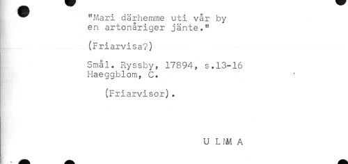 //// * "Mari därhemme uti vår by //// en artonåriger jänte*" //// (Friarvisa?) //// Smål. Ryssby, 17894, s.13-16 //// Haeggblom, C. //// (Friarvisor). //// U LIM A //// — _ ^ ////