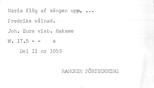 //// t //// < //// i //// Maria flög af sängen uppi, ... //// Fredriks vålnad, //// Joh. Eurs visb. Maksmo //// W. 17.5 - - s //// Del II nr 1053 //// RANCKEN FÖRTECKNING ////